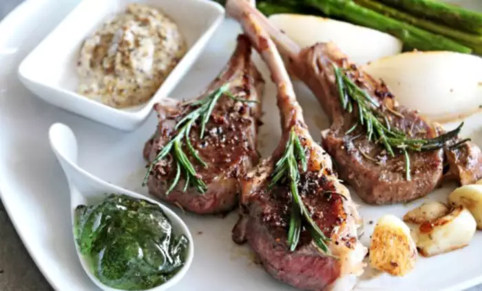 – 레드와인 소스: 양갈비를 구운 팬에 남겨진 기름에 레드와인 200ml를 넣고 졸인다. 진득한 농도가 되면 버터 1/2큰술, 소금, 후춧가루를 넣어 고루 섞어 윤기가 흐르면 불을 끄고 양갈비스테이크와 곁들인다. 재빨리 끓어오르니 레드와인 소스를 만들 때는 팬을 주시하고 있어야 타지 않는다.