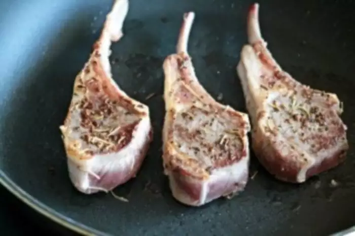 - 손질한 양갈비를 오일 5큰술을 두른 팬에 넣어 표면을 굽는다. 속을 익히는 것이 아니라 표면만 굽는 것이 중요하므로 빠른 속도로 팬프라이한다.