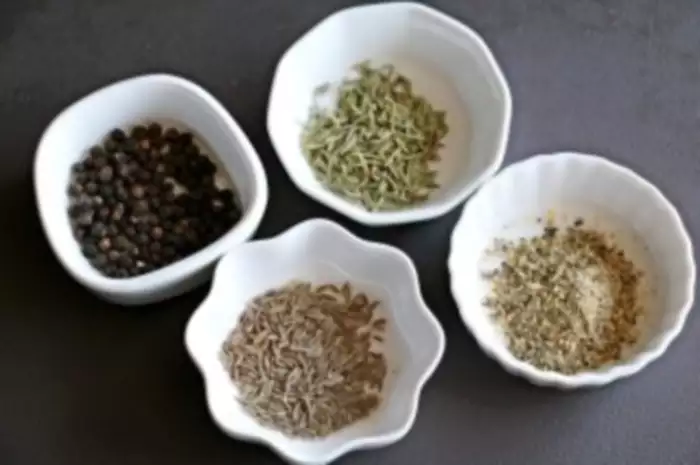 - 중간 크기 프라이팬에 큐민, 참깨, 피스타치오를 넣고 노르스름해질 때까지 볶아 절구에 옮겨 담는다.