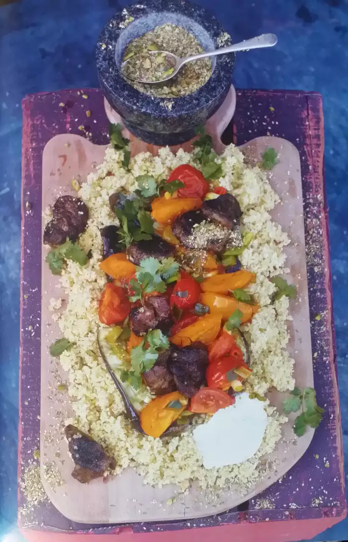 가지구이와 파삭한 큐민을 곁들인 즉석 양고기 타진 만들기