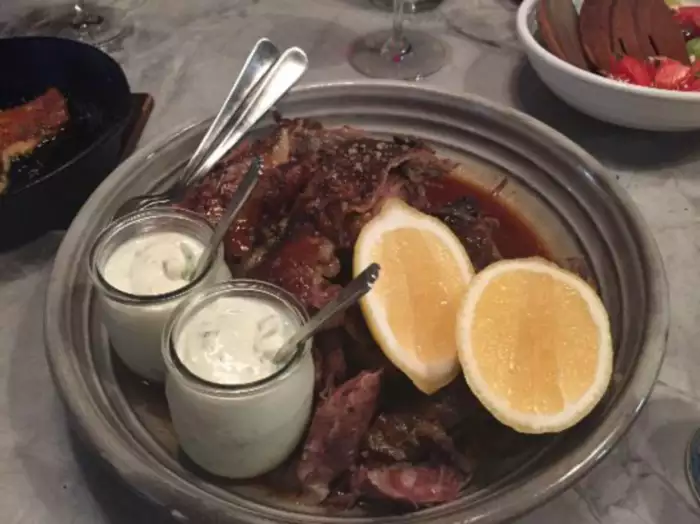 완성된 고기는 특별한 재료 없이도 완벽하기 때문에 간단하게 레몬과 그릭 요거트만으로 서빙된다. 더욱 완벽한 식사를 원한다면 치즈를 노릇하게 구워 오레가노와 달콤한 꿀이 곁들여진 Saganaki를 사이드로 주문해보자.