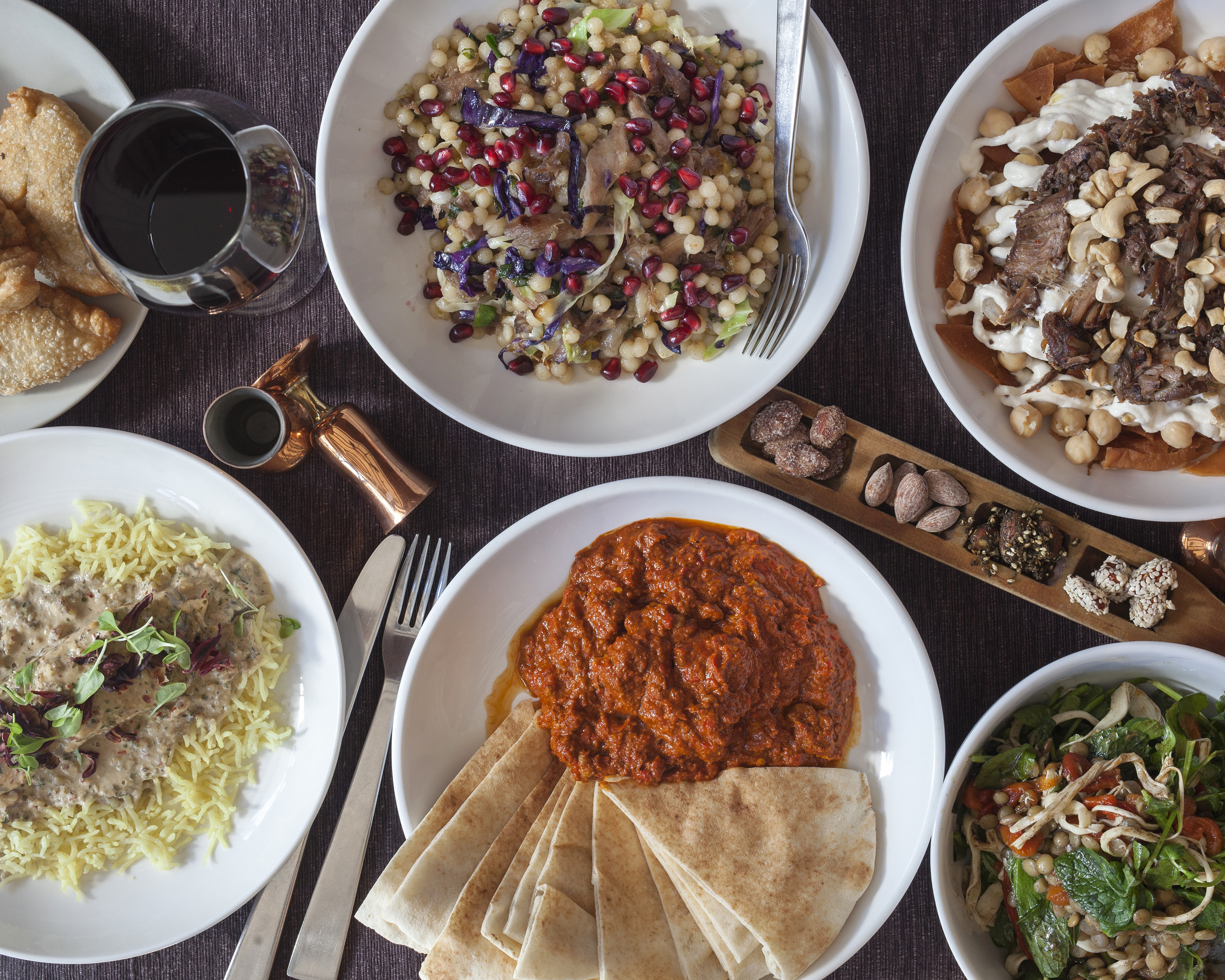 - 완성된 양고기 그릇에 모든 소스와 식용꽃잎을 곁들인다.