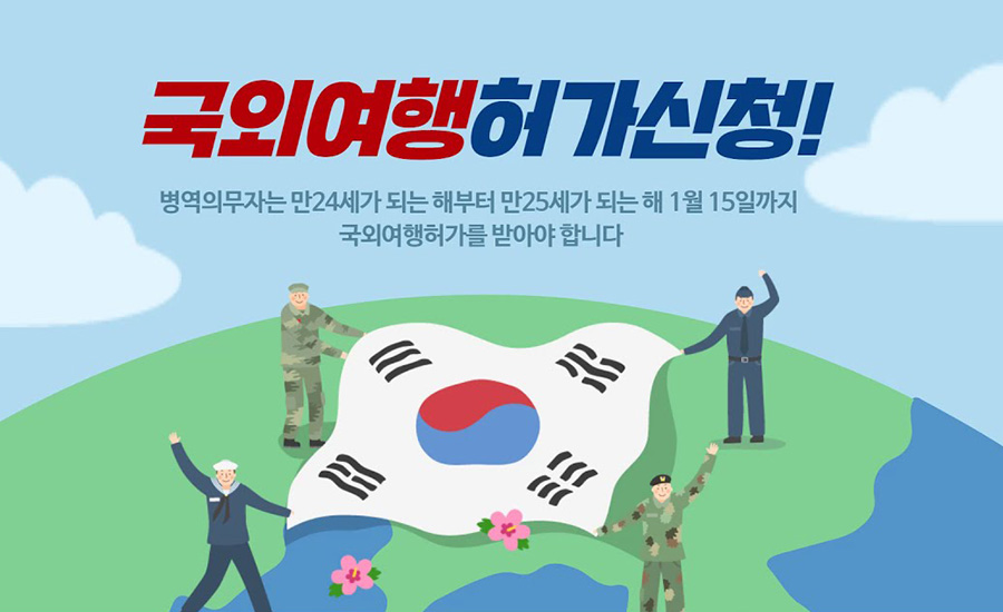 대한민국 국민으로 병역을 이행하지 않은 18세-37세까지의 남성은 병역법 제70조에 따라 25세가 되는 해 1월 1일부터 국외여행허가 의무가 발생한다. 따라서 올해 24세 (2001년생)인 병역의무자가 25세 이후 출국 또는 계속 국외에 체재 및 거주하고자 할 때에는 24세가 되는 해 1월 1일부터 25세가 되는 해 1월 15일까지 병무청장의 국외여행허가를 받아야 한다.