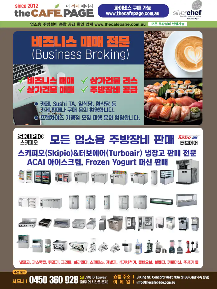 기존 해오던 대로 한국산 스키피오 냉장고를 비롯한 모든 업소용 주방장비들을 착한 가격에 공급하고 있다. 아울러 비즈니스매매 중개업무를 개시한 더까페페이지는 까페, 스시숍, 일식당, 한식당, 미용실 등 많은 매물을 보유하고 있으며 바이어 정보도 다량 보유하고 있다. 까페 매물리스트는 인스타그램 @thecafepage2023에서 확인할 수 있다. 비즈니스매매 중개업무 관련 문의는 0450 360 928 / julliano62@gmail.com (이병기)로 하면 된다. 문의: 0450 360 928 / info@thecafepage.com.au