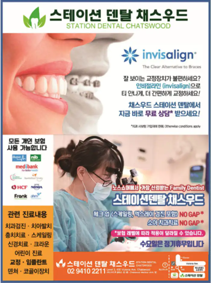 각종 검진에서부터 발치, 충치치료, 스케일링, 신경치료, 어린이 진료, 크라운, 교정, 임플란트, 덴쳐, 코골이 장치 등 치과 전반에 걸쳐 진료 및 치료하는 스테이션 덴탈은 채스우드역 울워스 옆 3층 (Level 3, 430 Victoria Ave. Chatswood NSW)에 위치하고 있으며 매주 수요일은 휴진한다. 문의: 02 9410 2211