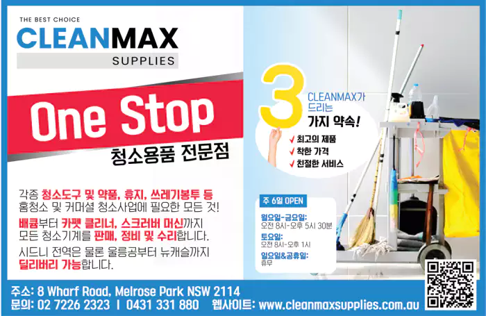 교민운영 원스톱 청소용품전문백화점 클린맥스 (CLEANMAX Supplies)가 새롭게 개발 중인 멜로즈팍 (8 Wharf Road, Melrose Park NSW)에서 각종 청소용품들을 기분 좋은 가격에 공급하고 있다.
