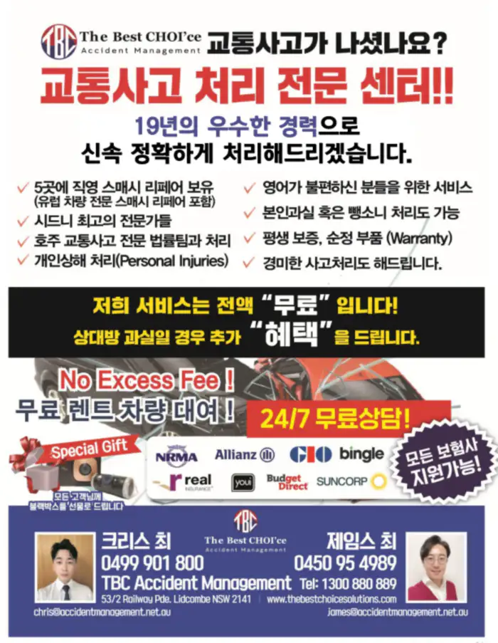 5곳에 직영 스매시리페어를 보유하고 있으며 교통사고전문 법률팀이 언어불편 없는 친절한 서비스를 제공한다. The Best CHOI’ce Accident Management는 53/2 Railway Pde. Lidcombe NSW에 자리하고 있다. 문의: 0499 901 800 (크리스 최) / 제임스 최 (0450 95 4989)