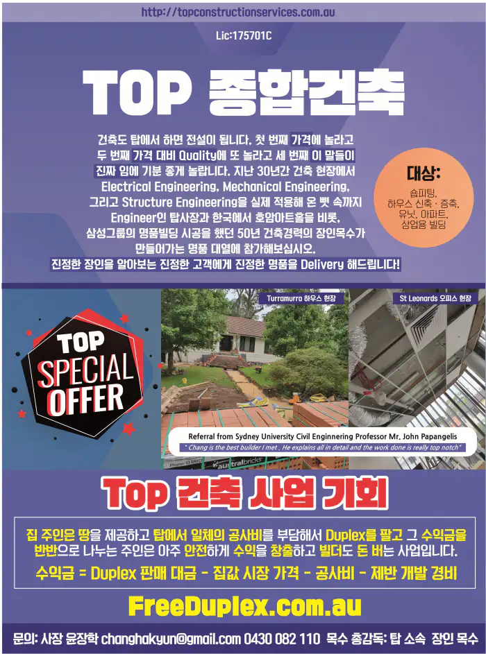 TOP종합건축은 스페셜 오퍼로 ‘공짜로 Duplex House를 지어드립니다’를 진행하고 있다. 듀플렉스를 지을 수 있는 대지를 소유하고 있는 고객을 대상으로 하며 공사기간 1년 동안 아파트 렌트비를 지원한다. 1년 뒤 한 채를 팔아 건축비로 충당하는 조건이다. 문의: 0430 082 110